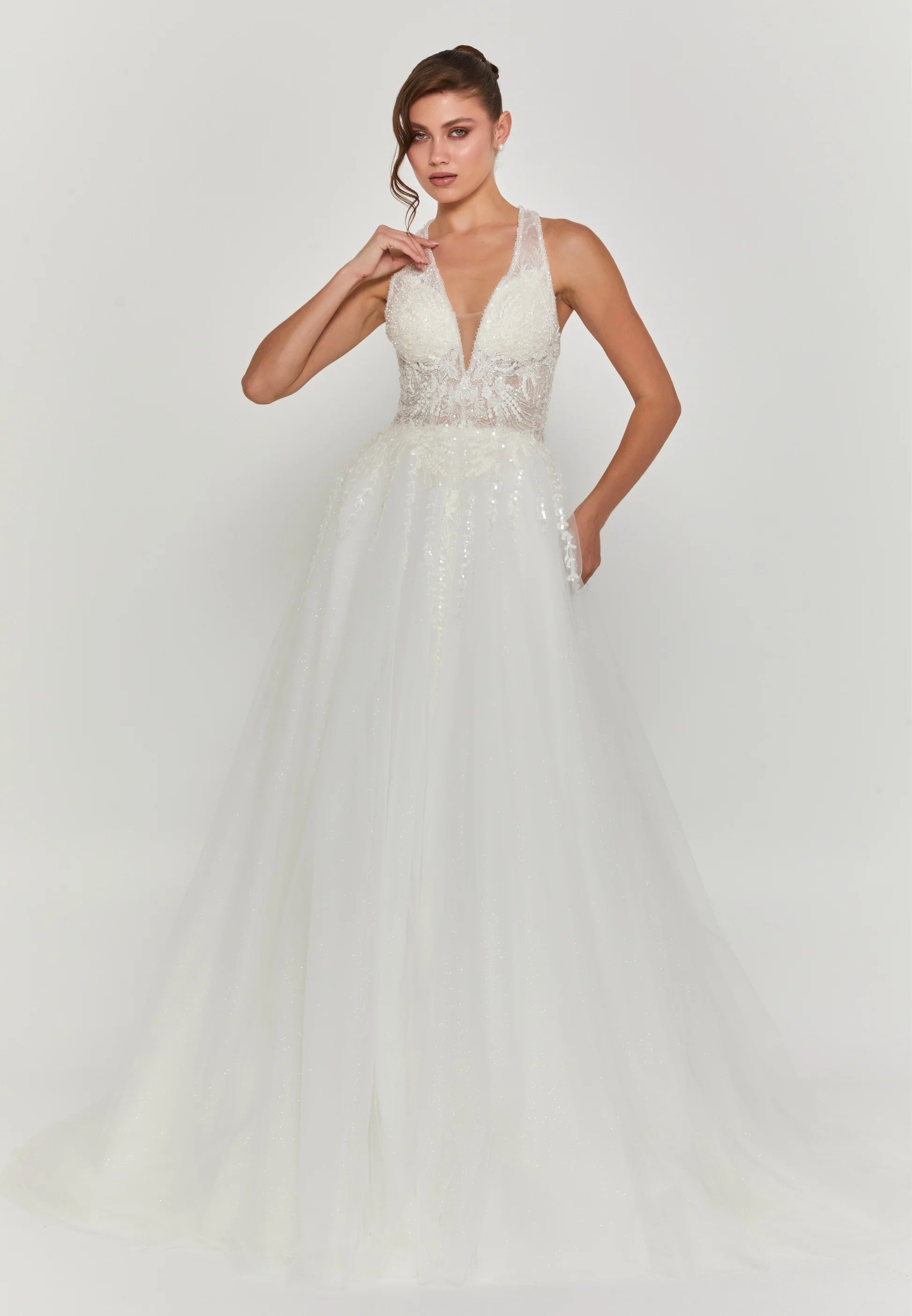Elegant and timeless, this sleeveless maxi wedding dress features luxurious tulle construction that creates a graceful, flowing silhouette. The classic design offers understated sophistication, allowing you to shine on your special day. Perfect for traditional ceremonies or modern celebrations, the airy tulle fabric drapes beautifully while maintaining structure. An ideal choice for brides seeking refined elegance without excessive embellishment.