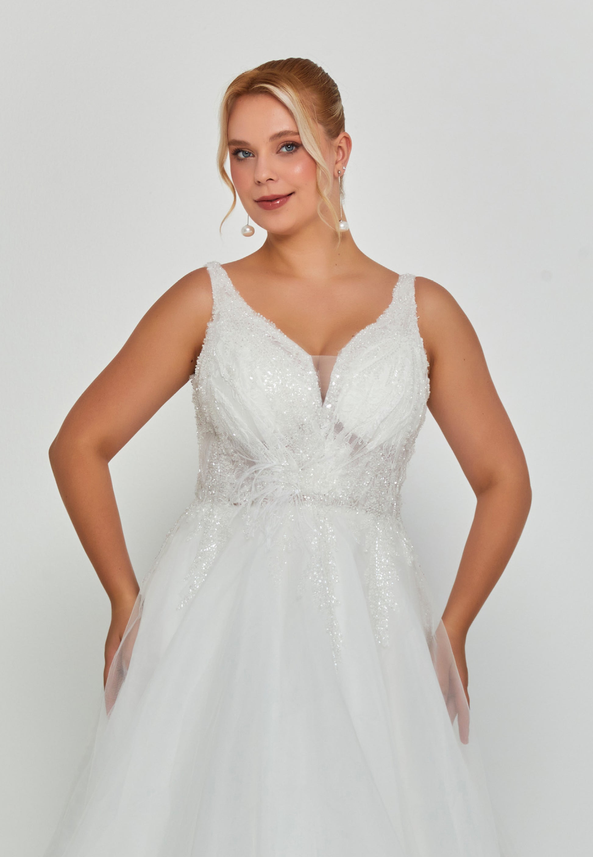 Elevate your bridal vision with this stunning sleeveless maxi tulle wedding dress, expertly designed for the modern plus-size bride. The ethereal tulle fabric creates an enchanting silhouette with graceful movement, while the sleeveless cut offers timeless elegance and versatility for layering with your choice of accessories. The flowing maxi length provides dramatic presence and refined sophistication. Perfect for creating an unforgettable entrance, this dress combines comfort with couture-inspired design, allowing you to feel confident and radiant on your special day.